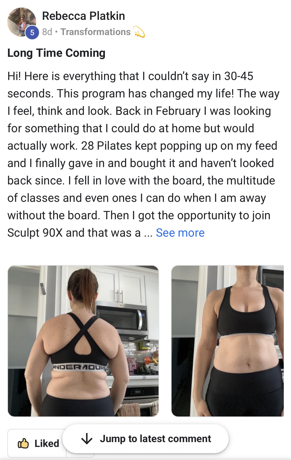 Last summer I hated how I looked and felt turning 40. I started with Mounjaro, then discovered 28 Pilates and everything changed. I’m now halfway through the bikini challenge, fitting workouts into my busy schedule, and finally feeling confident in my own skin. So grateful I found this program!