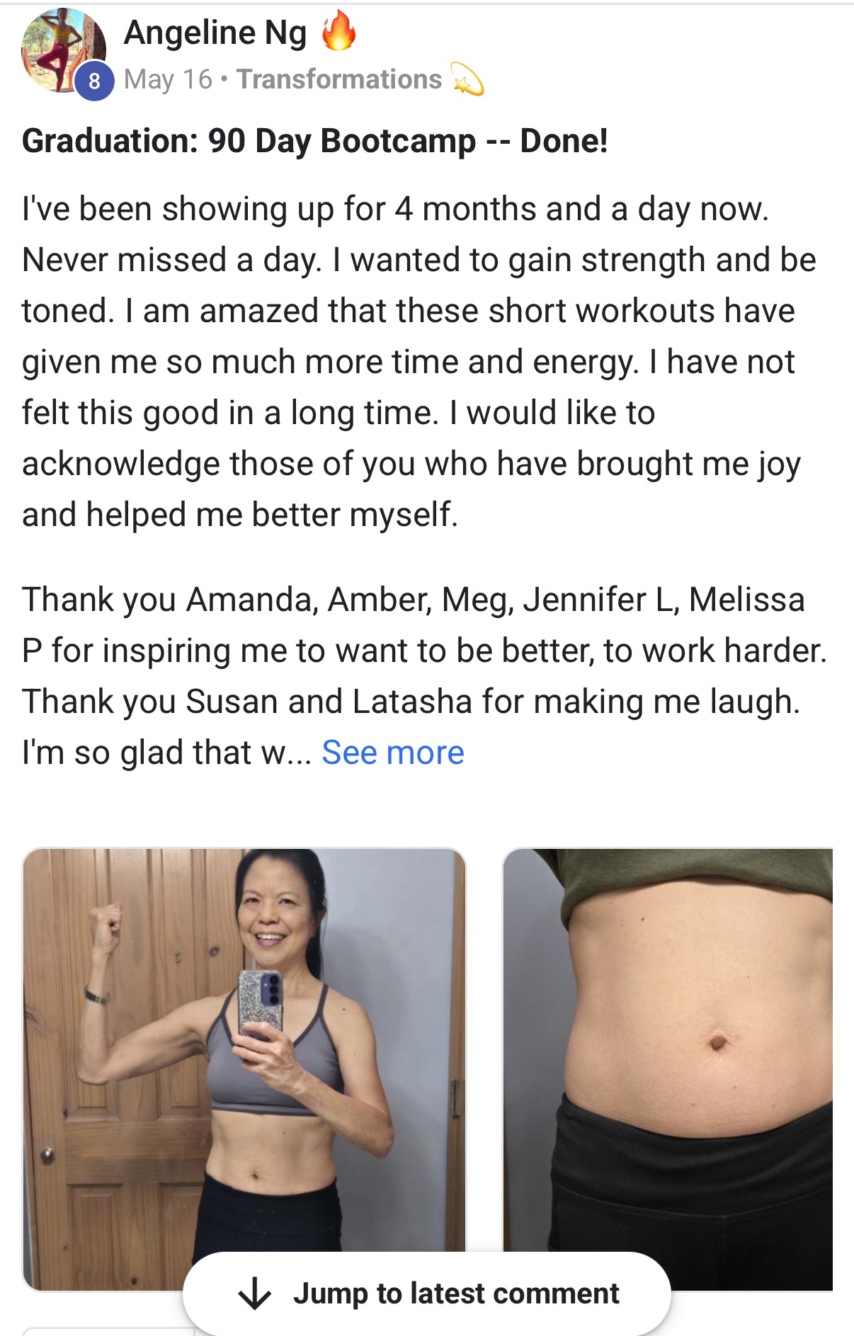 I started with the 28-Day Challenge in May and now I’m 19 days into the 90-Day Bootcamp. I feel stronger, more toned, and I can actually see the difference in my body. At 46 years old, I’m proud of myself — and living proof it’s never too late to change.